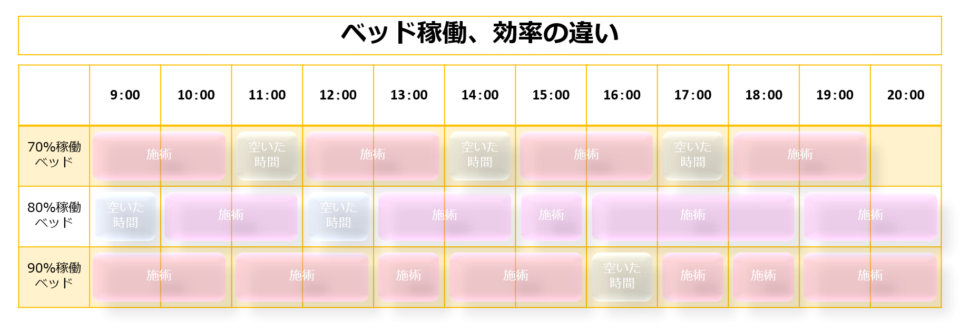 しかし問題は、営業時間に対してどれだけベッドが稼働しているのか(「稼働時間・稼働率」がどの程度か)という点。常にすべてのベッドが埋まっていれば理想ですが、予約の関係やスタッフの人数などにより空白の時間もあることが想定されます。