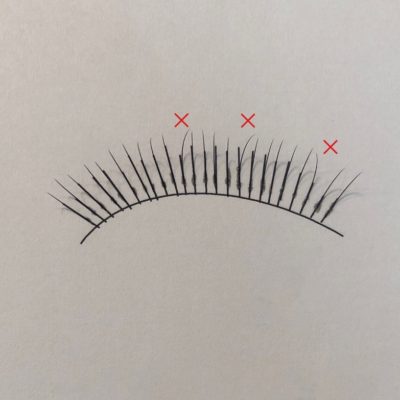 こちらはNG例。×印の箇所のようにエクステの向きがずれていると、OK例のようなきれいな放射状になりません。数か所ずれるだけでも全体の仕上がりが明らかに変わってくるので、練習を重ねてエクステの正しい向きをマスターしましょう。
