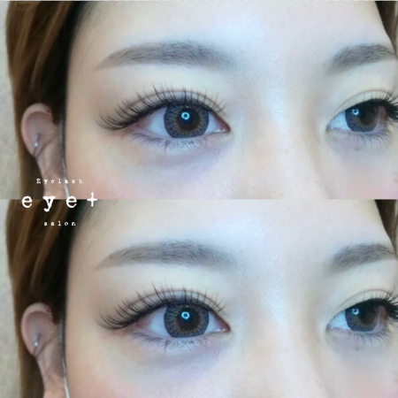 丸みのあるキュートデザインで、フラットラッシュを100本装着。装着本数が少ない分1束1束の濃さも強調されすぎず、大人かわいい仕上がりになっています。