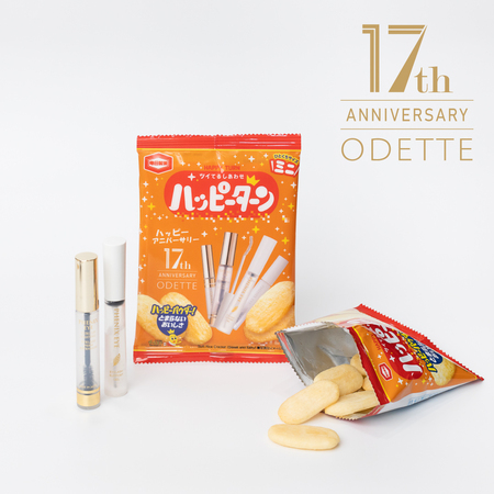 2023年の周年キャンペーンでカルビーとオデットがコラボしたオリジナルパッケージの「かっぱえびせん」を覚えていますか?オデットの人気定番商品「フェニックスアイコーティングシリーズ」とかけて「やめられない、フェニックスアイコーティング」をキャッチコピーにした、ユニークなノベルティでした。オデットらしさをちりばめたおしゃれなパッケージが印象に残っている方もいるのではないでしょうか。