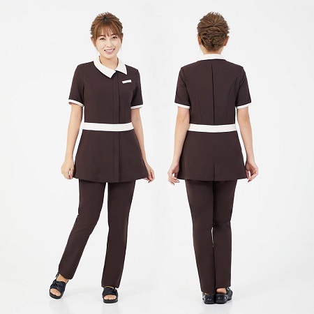 こちらは、「Veriella」の「チュニックH」。襟元のデザインが特徴的で、品でクラシカルな印象です。ウエストから裾に向けてはフレアがかかっているところもポイント。お尻部分もしっかり隠れるので、体型カバーが気になる人にもおすすめです。カラーは、ブラウン×クリームの1色。柔らかく明るい雰囲気のサロンにぴったりのユニフォームです。
